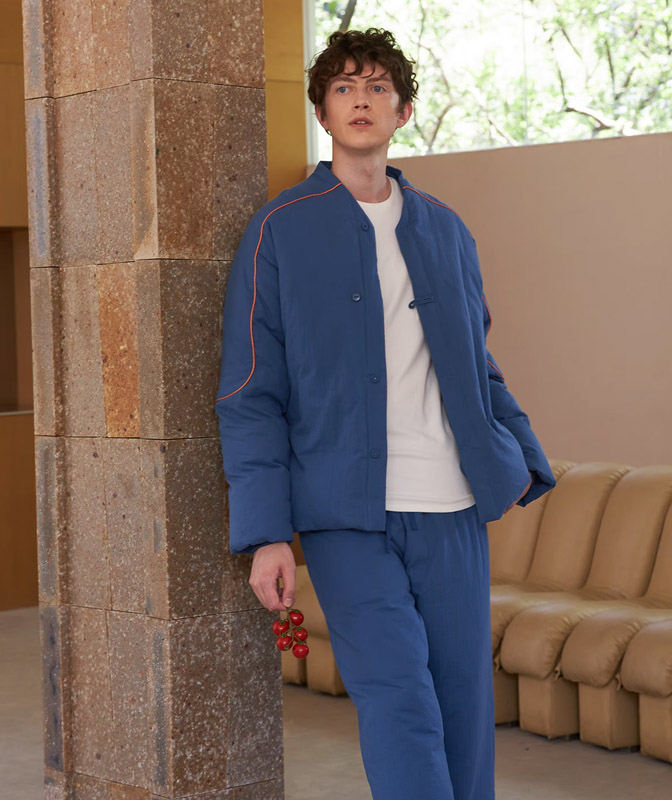 轻盈白鸭绒家居服男套装 撞色压线不跑绒 温暖微皱中式风格